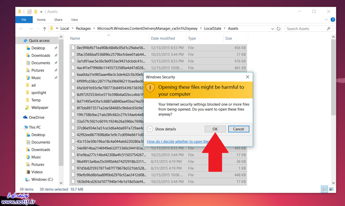 دستور زیر (مسیر پوشه ای که تصاویر Spotlight در آن ذخیره می شود) را در کادر Run وارد کرده و OK کنید. بهترین راه Copy و Paste است.