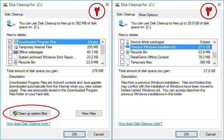 قدم سوم – پس از انتخاب گزینه Clean up system files مجدداً کادر انتخاب درایو نمایش داده می شود. دوباره درایو موردنظر را انتخاب و OK کنید. در کادر Disk Cleanup نمایش داده شده در قسمت Files to Delete گزینه های مختلفی وجود دارد. گزینه Previous Windows Installation(s) مشخص کننده فایل های ویندوز قبلی می باشد که می توانید میزان حجم اشغال شده توسط این فایل ها را از درایو انتخاب شده مشاهده کنید. با انتخاب این گزینه و فعال کردن آن (تیک زدن آن) و OK کردن عملیات پاکسازی پوشه Windows.old و دیگر موارد انتخاب شده شروع می شود. می توانید گزینه های دیگر را در صورت تمایل جهت پاکسازی انتخاب کنید.