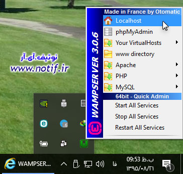 در آخر ومپ سرور با موفقیت نصب شده است. اگر آن را اجرا کنید آیکون آن در کنار ساعت در قسمت اعلانات ویندوز نمایش داده می شود. و می توانید از آن استفاه کنید. برای کار با ومپ سرور می توانید بر روی آیکون آن در نوار وظیفه در کنار ساعت چپ کلیک کرده و از منوی نمایش داده شده گزینه مورد نظر خود را انتخاب کنید.