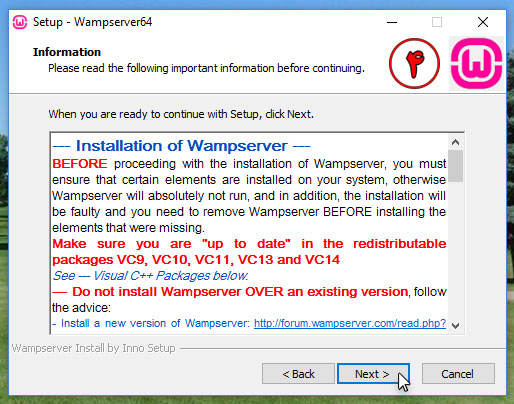 قبل از شروع عملیات نصب باید مطمئن شوید که برنامه های پیش نیاز برای اجرای صحیح سرویس های Apache، MySQL و PHP بر روی سیستم شما نصب شده باشند. در غیر اینصورت ومپ سرور و سرویس های آن بدرستی اجرا نخواهند شد و عملیات نصب نیز بصورت معیوب انجام خواهد شد. در این حالت لازم است پس از نصب پیش نیازها ابتدا این نسخه معیوب نصب شده حذف گردد و مجدداً ومپ سرور نصب شود.