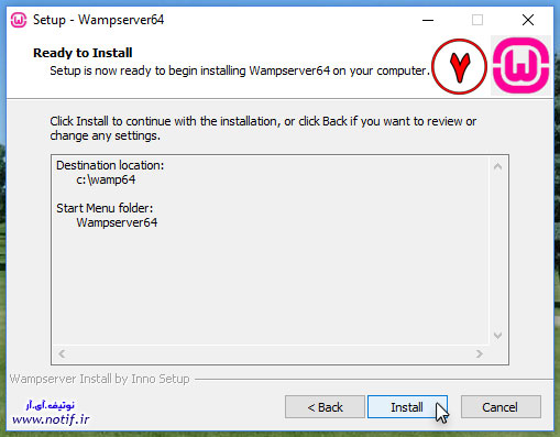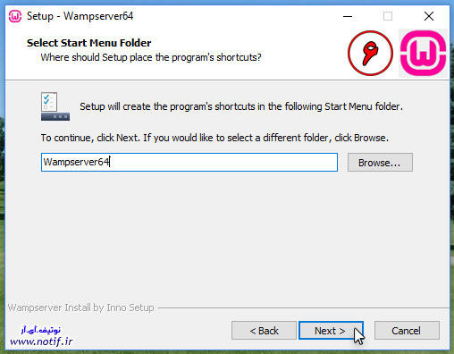 در ادامه می توانید مسیر نصب ومپ سرور را مشخص کنید. بصورت پیش فرض خود برنامه نصب بنا به نوع معماری سیستم مسیر c:\wamp64 یا c:\wamp را انتخاب کرده است.