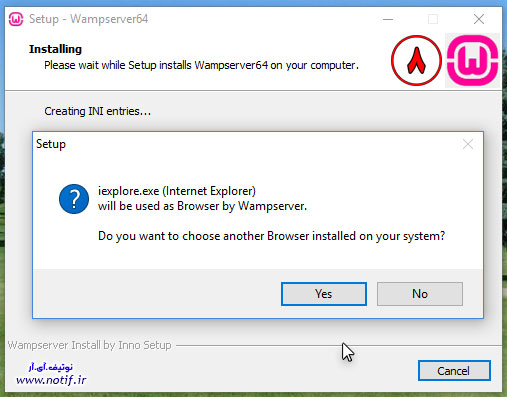 ومپ سرور بصورت پیش فرض از مرورگر Internet Explorer استفاده می کند اگر مایل به استفاده از مرورگر دیگری بغیر از IE هستید باید در کادر بالا با انتخاب گزینه Yes مسیر فایل اجرایی آن مرورگر را به ومپ سرور معرفی کنید. می توانید از مرورگر کروم یا فایرفاکس به عنوان جایگزین استفاده کنید.