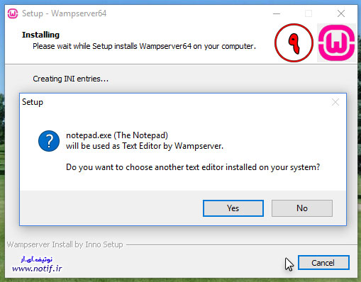 همچنین ومپ سرور برای ویرایش فایل های تنظیمات نظیر فایل تنظیمات آپاچی با نام httpd.conf و … از برنامه Notepad استفاده می کند اگر مایل به تغییر این برنامه و استفاده از برنامه دیگری هستید می توانید با انتخاب گزینه Yes فایل اجرایی آن را به ومپ سرور معرفی کنید. پیشنهاد ما برنامه سبک و فوق العاده ++Notepad می باشد.