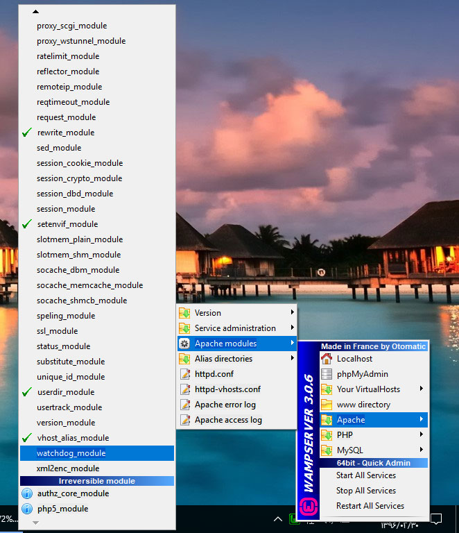 چپ کلیک بر روی آیکون ومپ در نوار وظیفه (در قسمت اعلانات) -> گزینه Apache -> گزینه Apache modules -> لیست ماژول ها